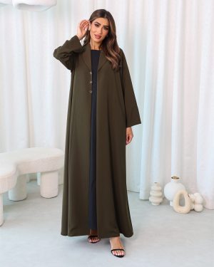 Shurooq Abaya is a graceful, modern-style green color abaya with elegant buttons on the front.
