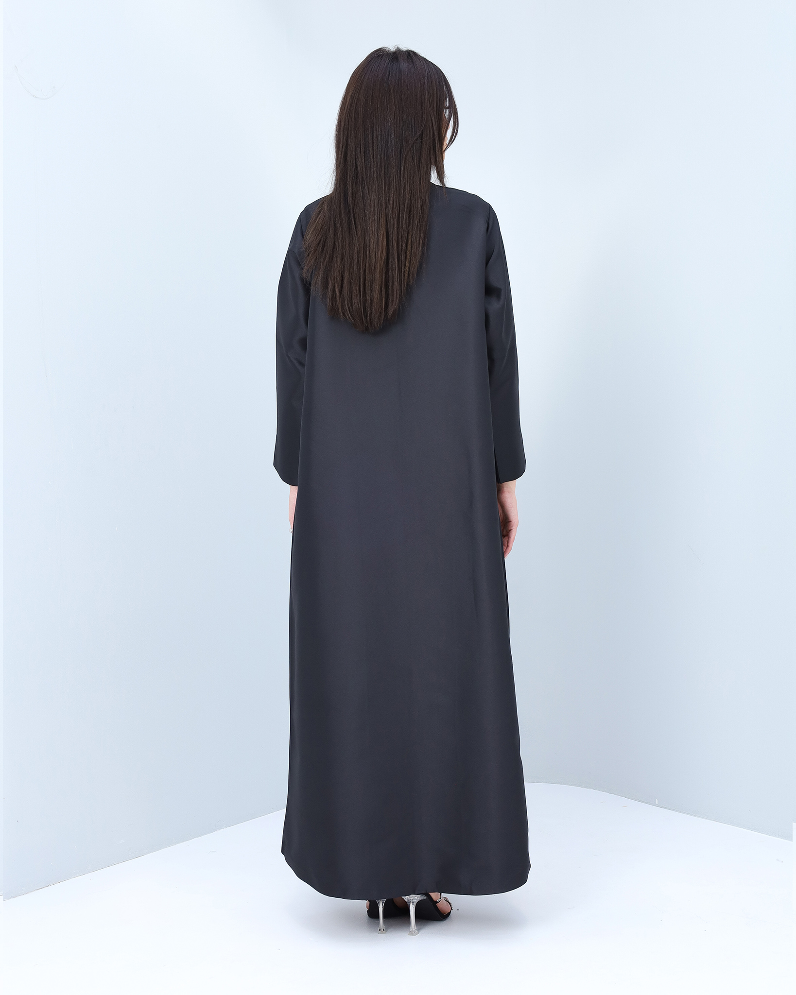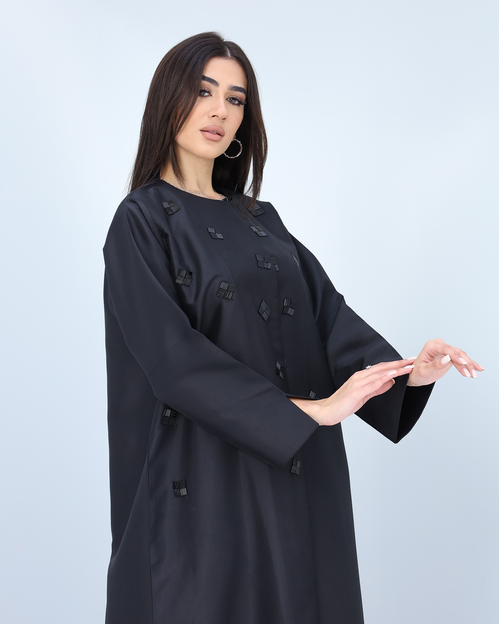 عباية الماس هي عباية كلاسيكية وفاخرة مع عمل يدوي من الأمام مع خرز كريستالي مذهل من الأمام. تألقي مع تصميم العباية المذهل هذا لتبدو أكثر جاذبية في التجمعات والاحتفالات.