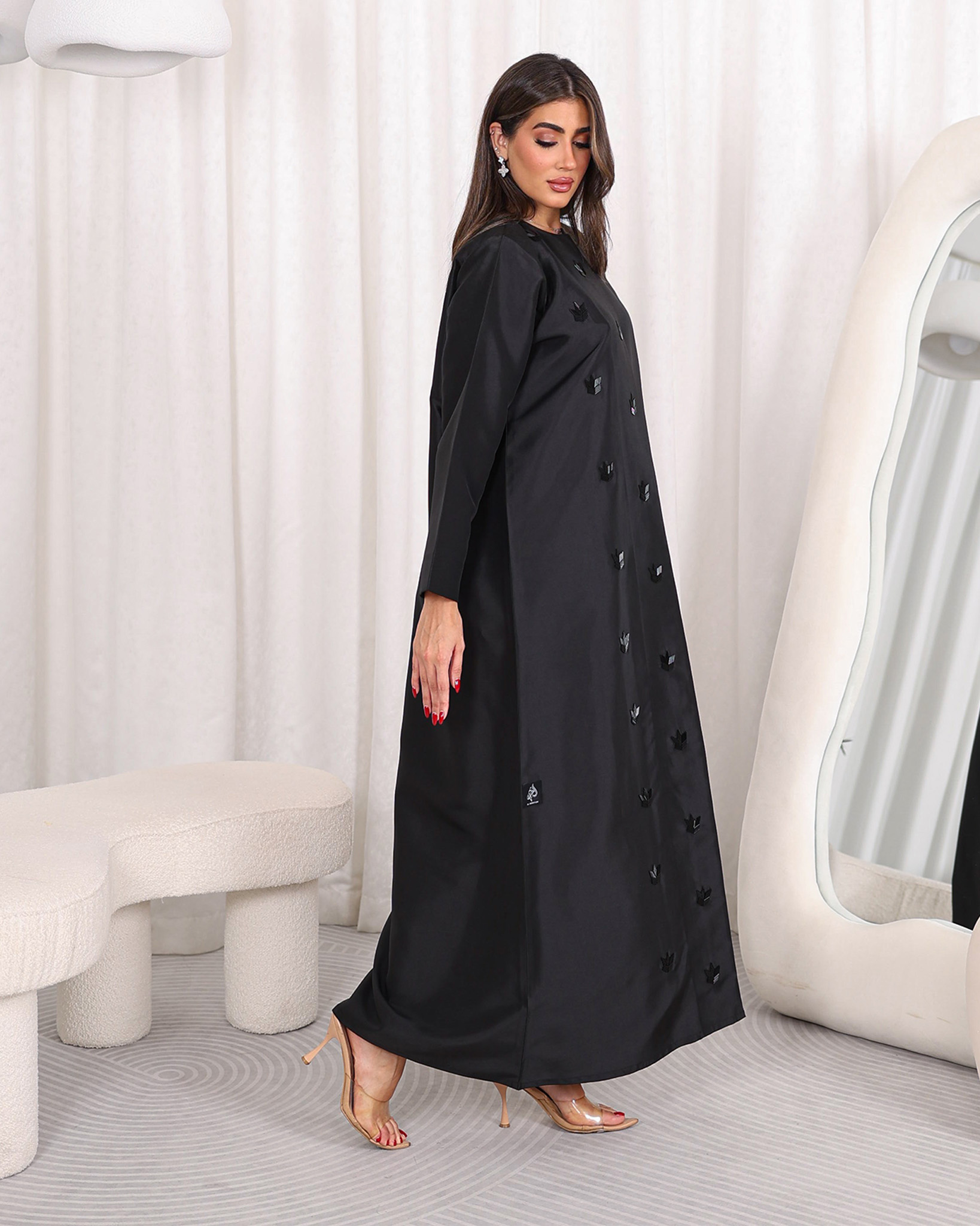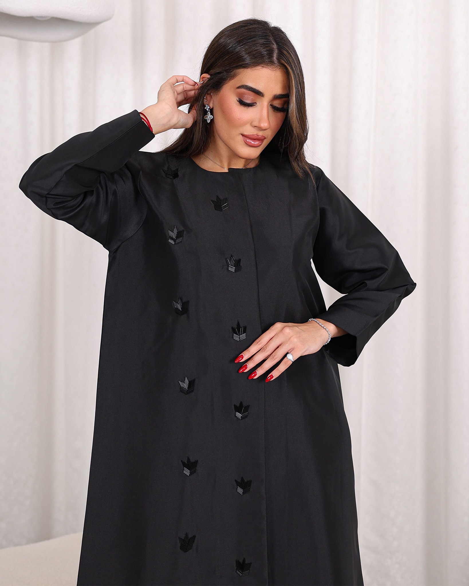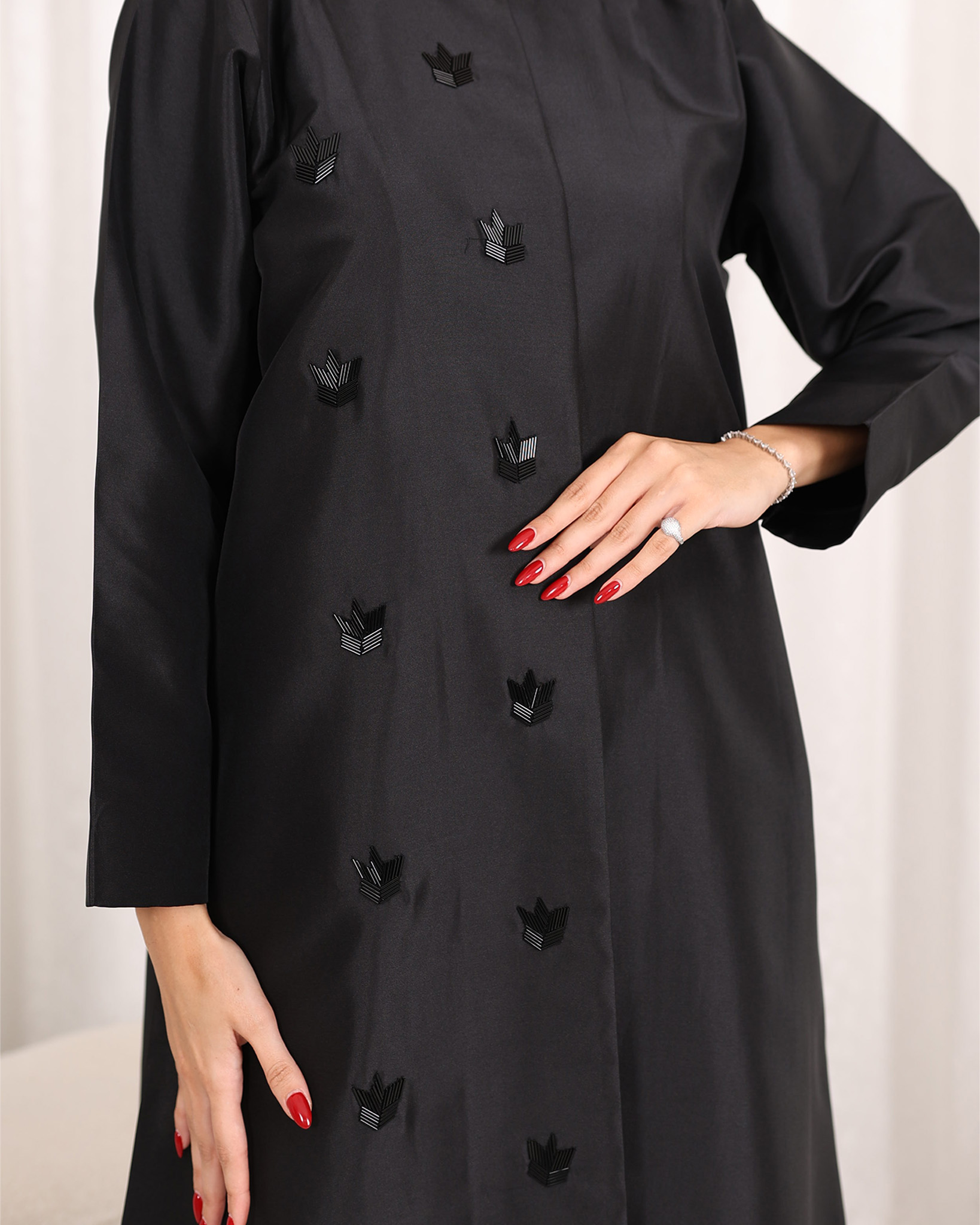 Dareen Abaya is a classic and fancy abaya with handwork on the front and stunning crystal beads on the front.