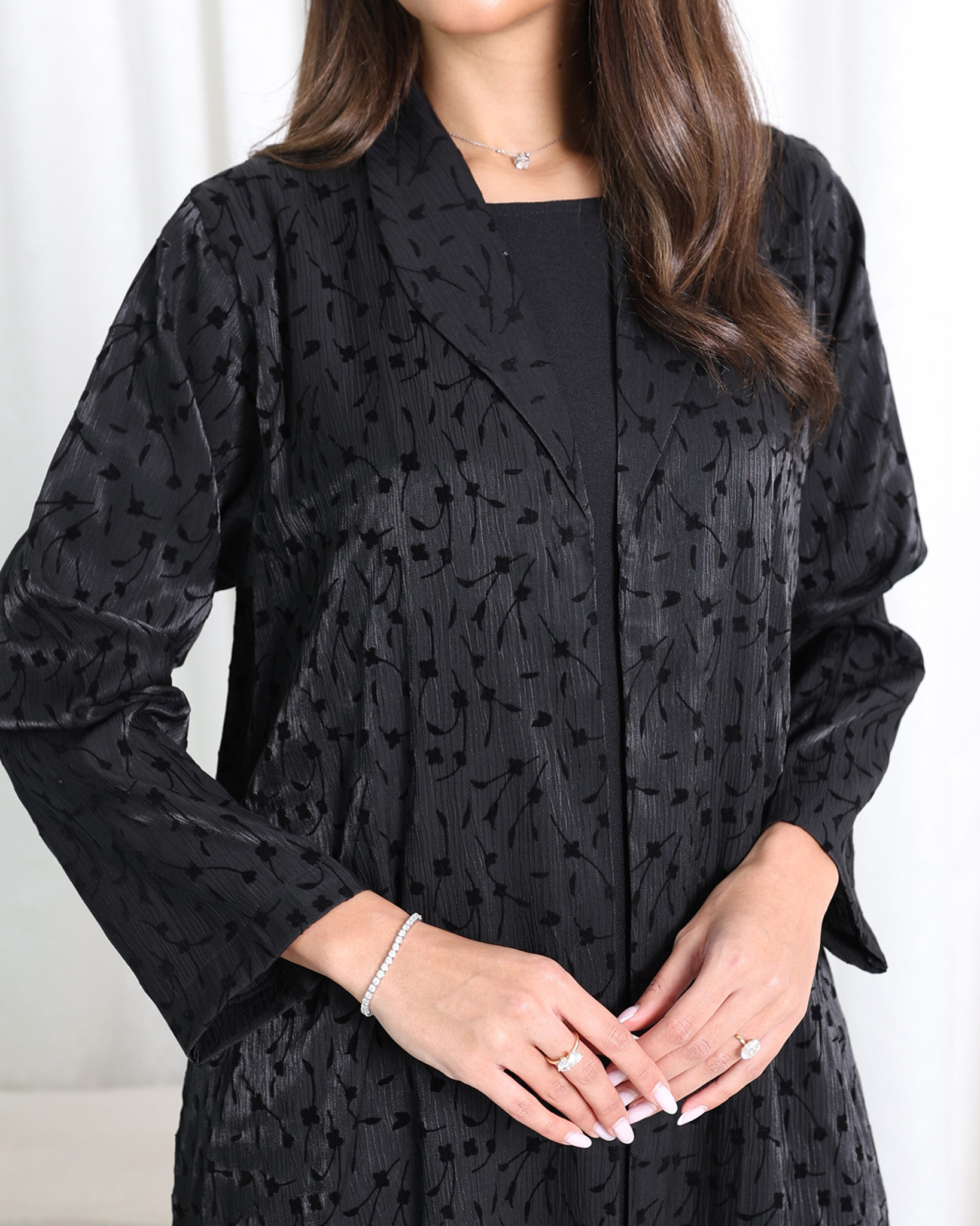 Crafted from premium shimmer fabric, this piece features delicate velvet intricately woven across the surface, creating a refined textured contrast that catches the light beautifully. The soft shimmer base enhances the richness of the black tone, while the velvet flower detailing adds depth and a luxurious tactile finish. Designed with a relaxed, flowing silhouette, the abaya drapes gracefully, offering comfort and elegance for formal gatherings, evening events, and special occasions.