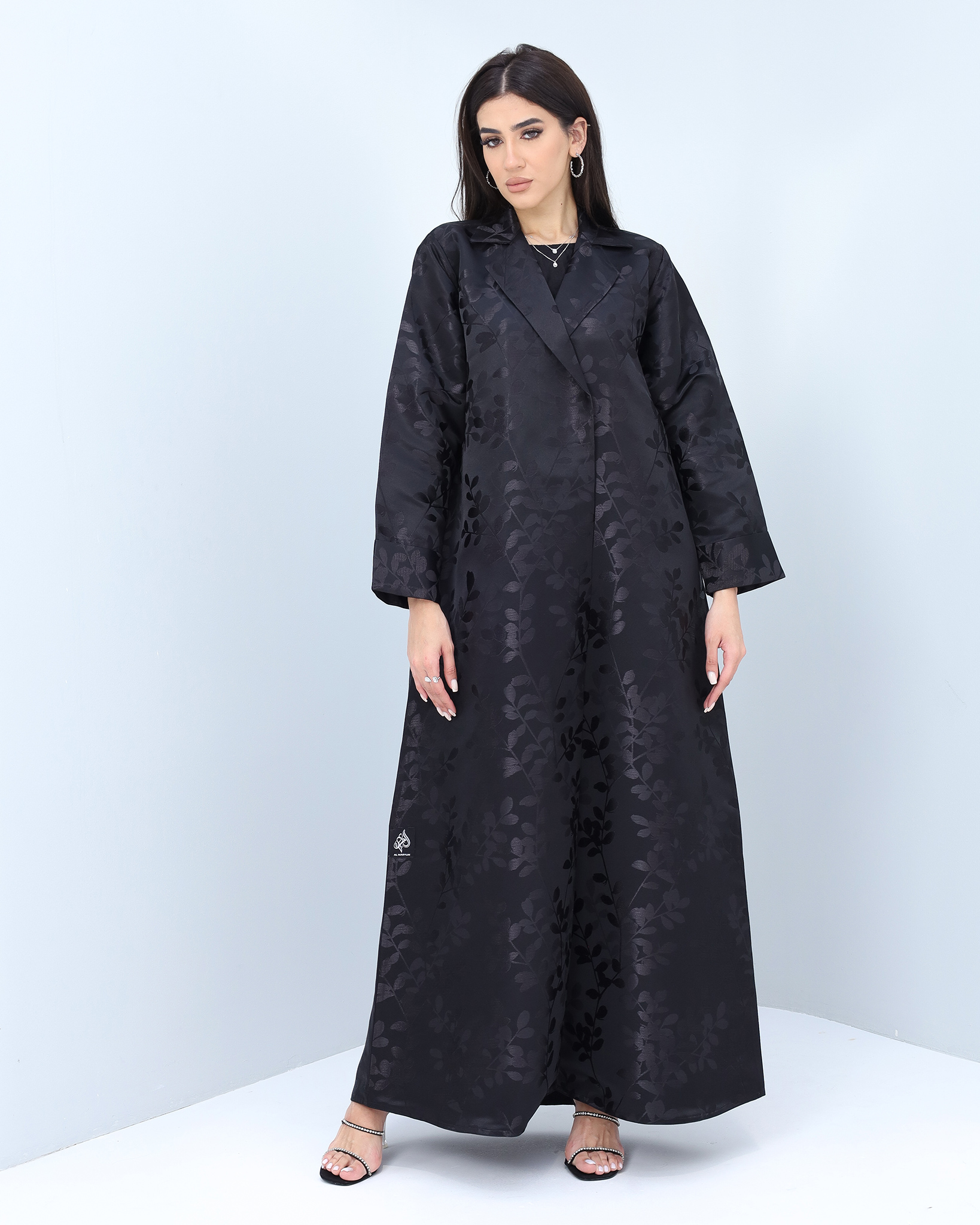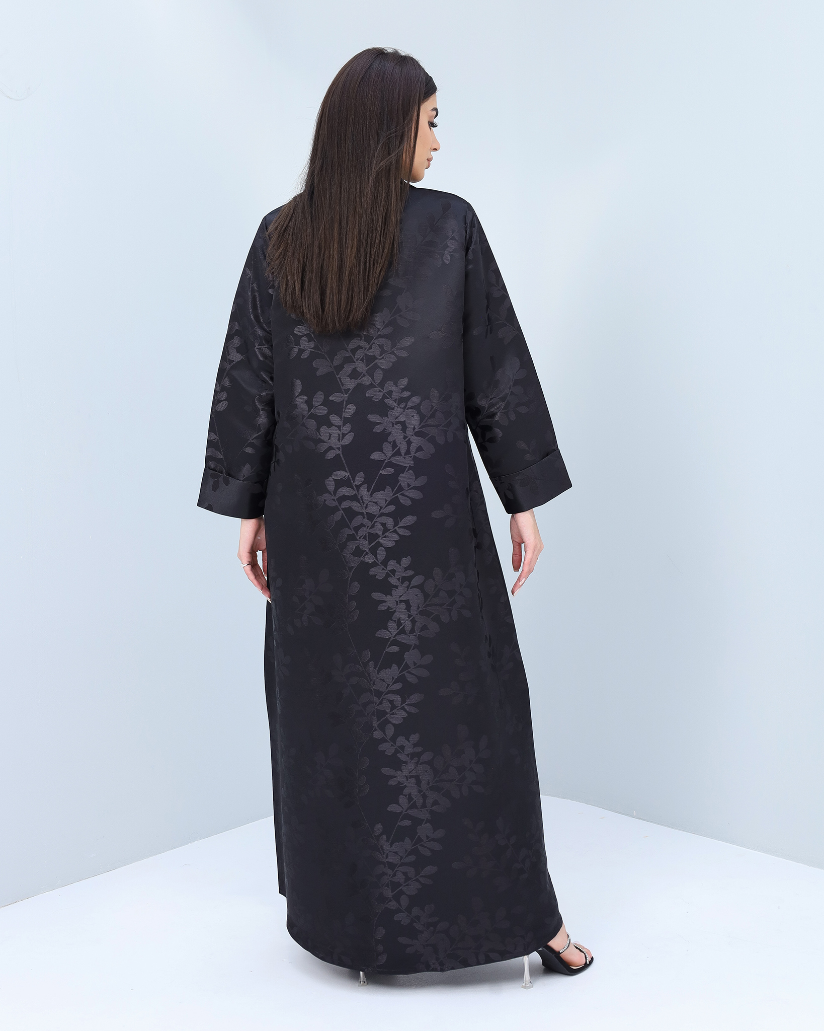 Classy self-patterned black collared abaya with folded sleeves. This abaya will give you an elegant look. Style yourself with this elegant embroidered abaya, and make sure to enhance your closet.