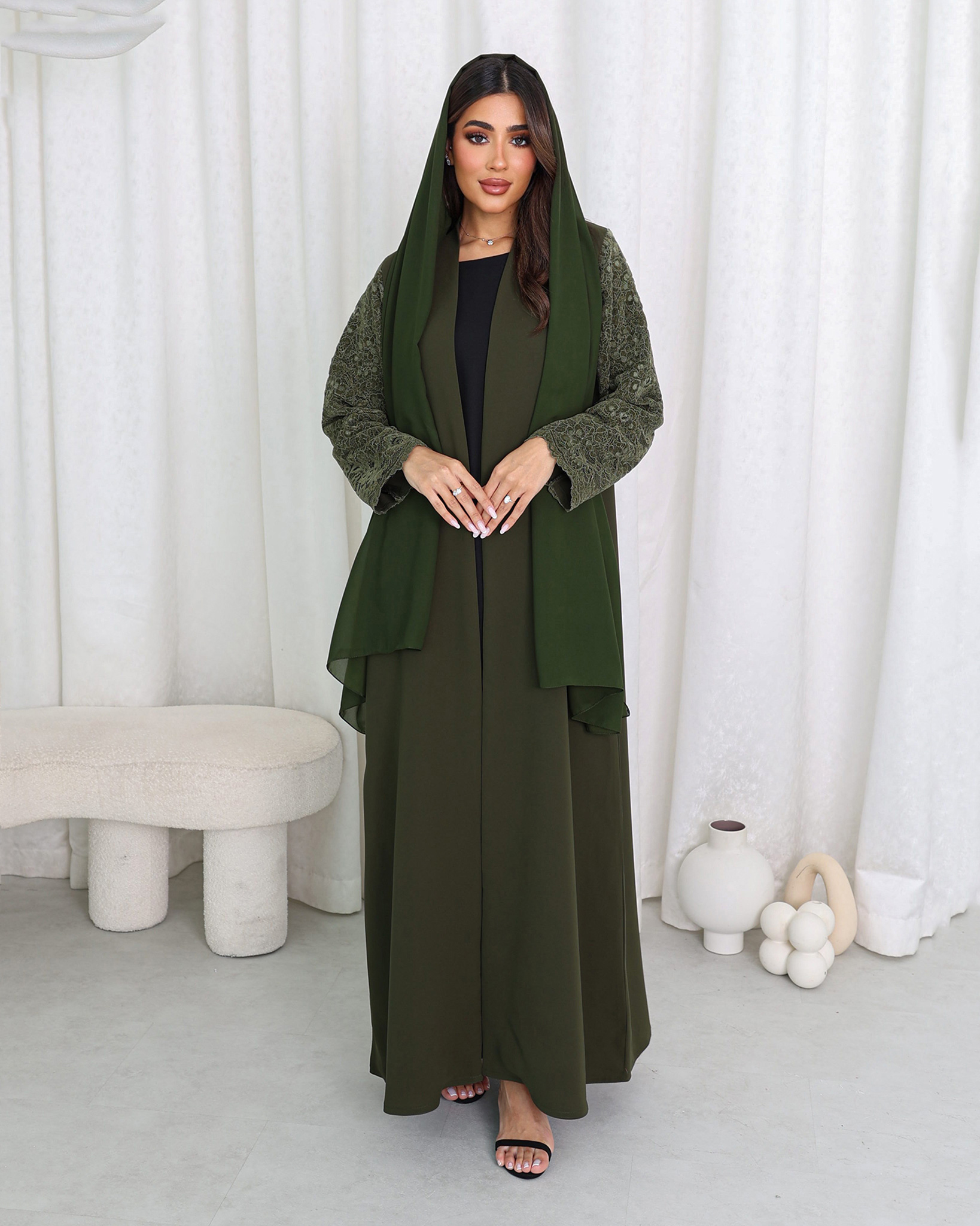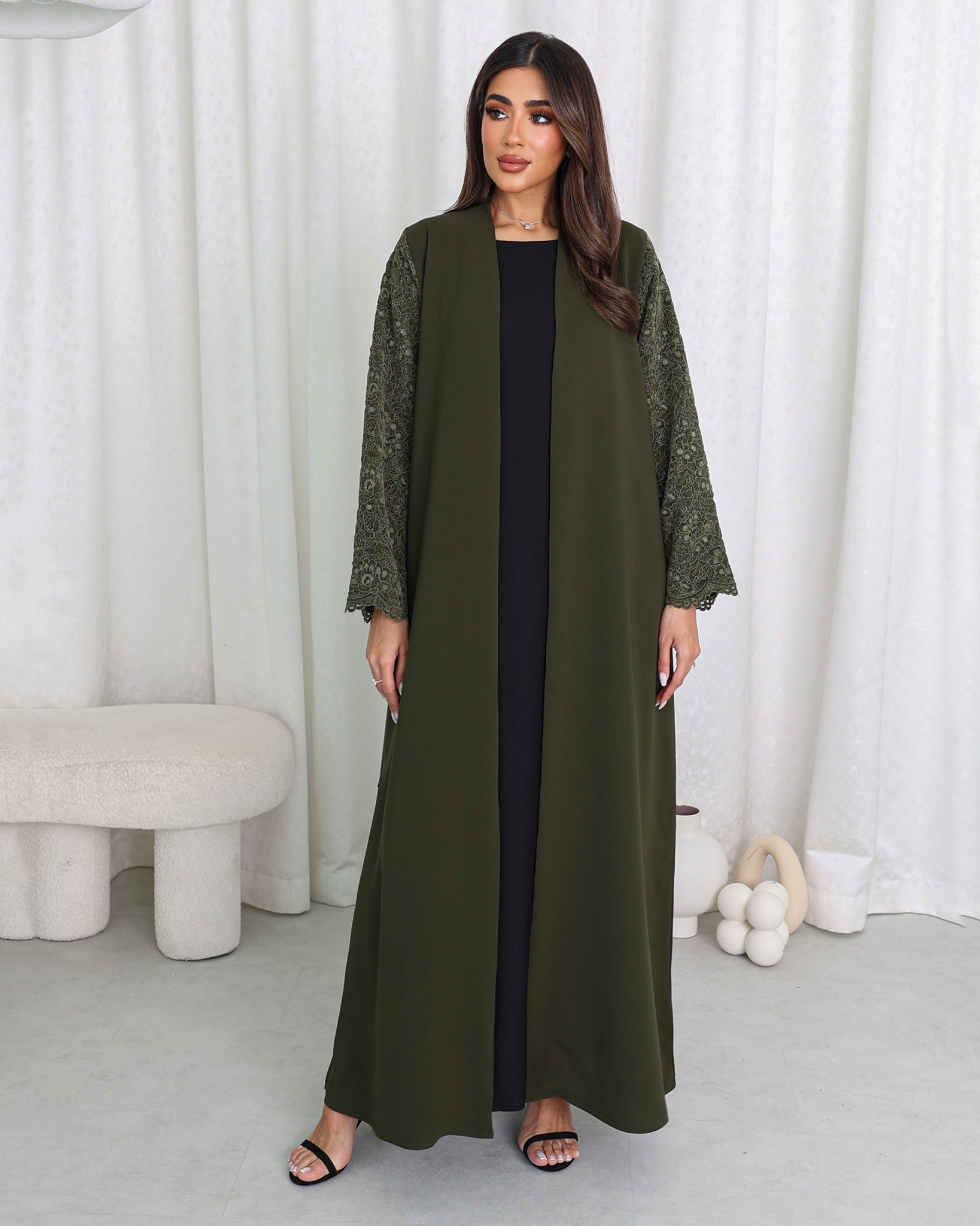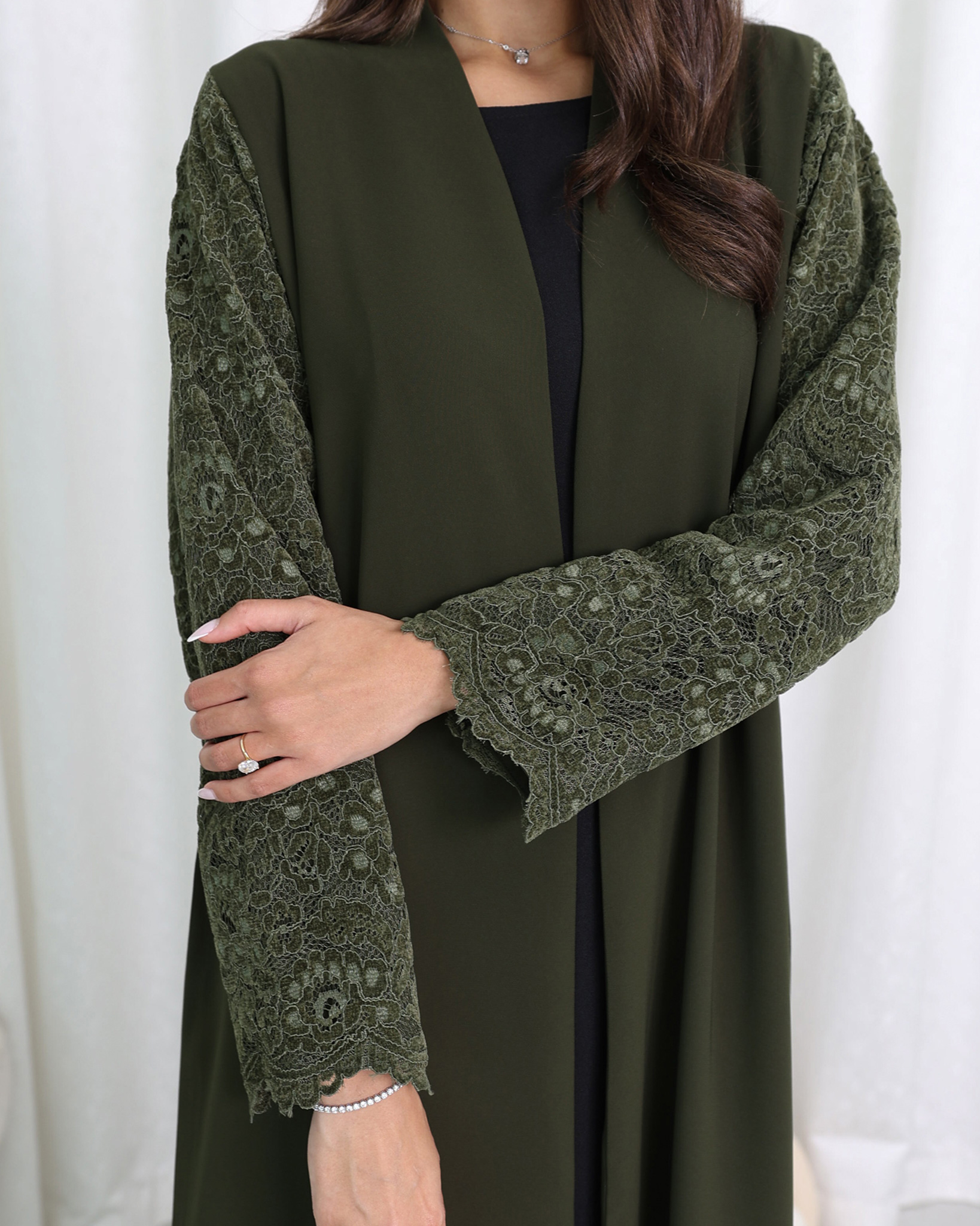 Muzna Abaya is green color abaya with dental sleeves. A sophisticated abaya crafted from premium crepe fabric in a rich green shade. Known for its smooth texture, soft structure, and elegant drape, Crepe offers a polished look while remaining lightweight and comfortable for all-day wear. The relaxed, flowing cut enhances movement while maintaining modest elegance. This beautiful piece is made from high-quality fabric and designed with attention to details ensuring comfort, fashion and quality. Muzna Abaya is perfect for occasions and gatherings. Order now and experience the ultimate in style and luxury.